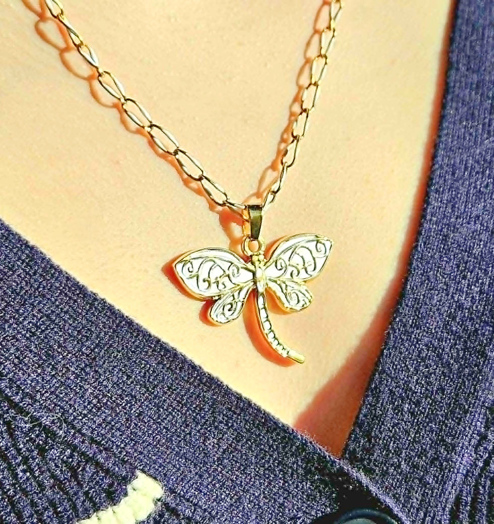 Métamorphose est un collier monté sur une chaîne plaquée or, rehaussée d’une touche de laque blanche lumineuse. Sa breloque libellule apporte du caractère et une présence légère à la fois.